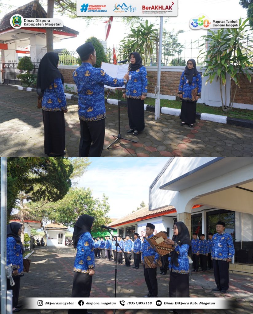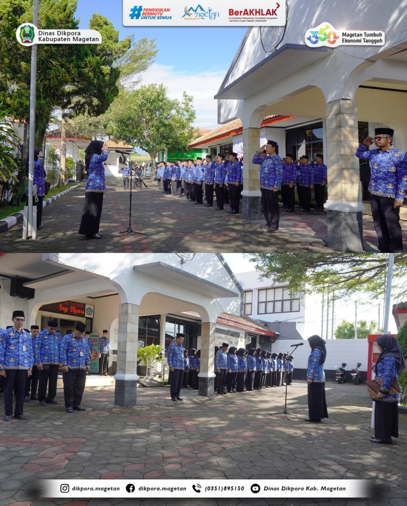 Upacara berlangsung khidmat dengan diikuti oleh seluruh ASN di lingkungan Dinas Dikpora. Pada kesempatan ini, Ibu Sekretaris Dinas bertindak sebagai pemimpin upacara.