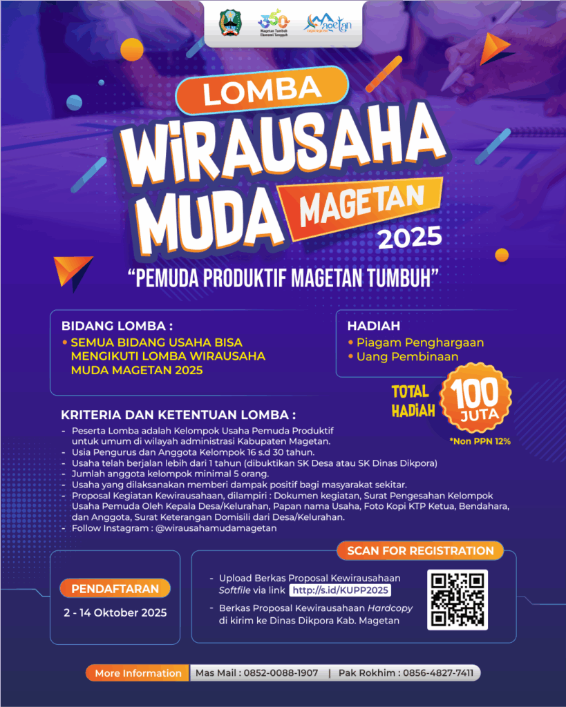 Pemuda Magetan bukan cuma generasi penerus, tapi juga generasi produktif agar Magetan tumbuh! 🚀 Saatnya pemuda Magetan buktikan karya, gagasan, dan inovasi terbaikmu di Lomba Wirausaha Muda Magetan 2025! Semua bidang usaha apapun berkelompok boleh ikutan🌟 Siapkan proposal kegiatan kewirausahaan terbaik! Rebut hadiah total seratus juta rupiah dan piagam penghargaan 🥇