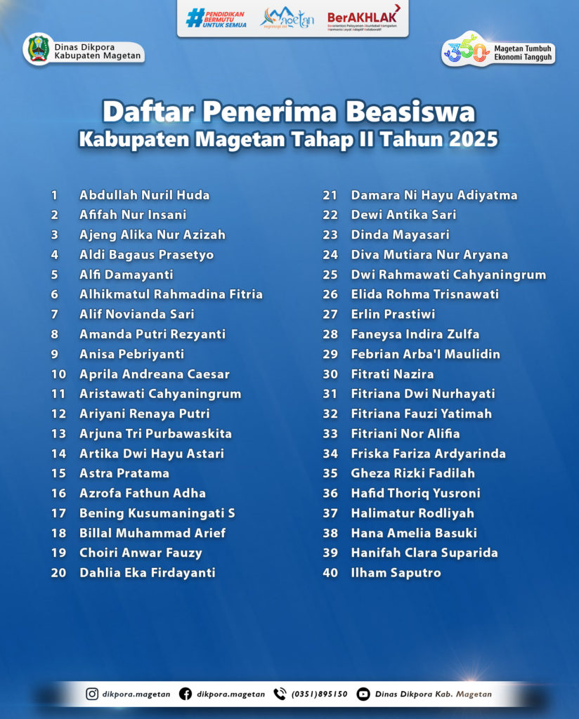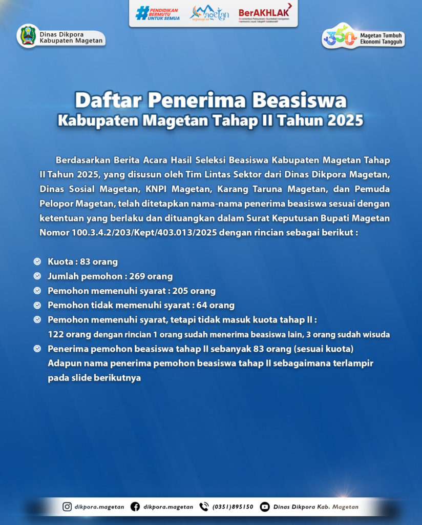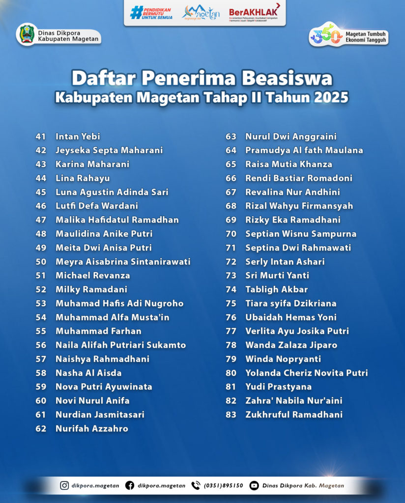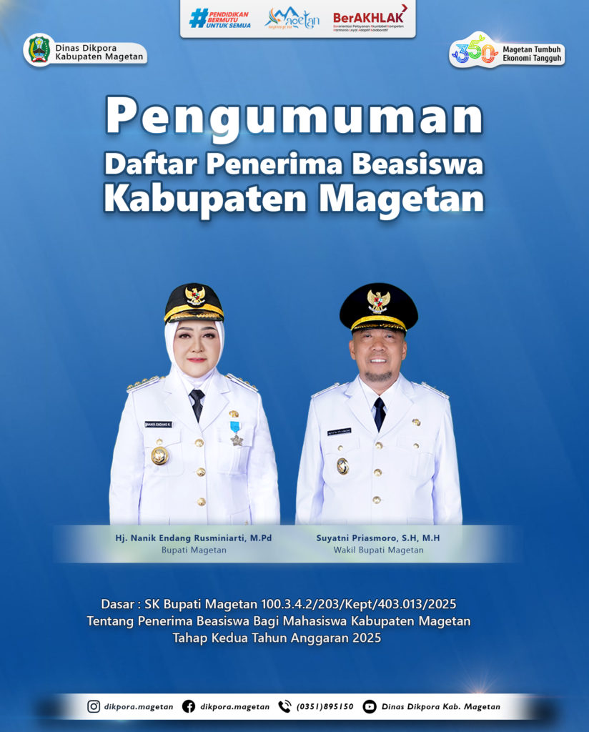 Updated on 2 Oktober 20252 Oktober 2025Berita Pengumuman Pengumuman Penerima Beasiswa Kabupaten Magetan Tahap II Tahun 2025 admin Slide 1Slide 2Slide 3Slide 4