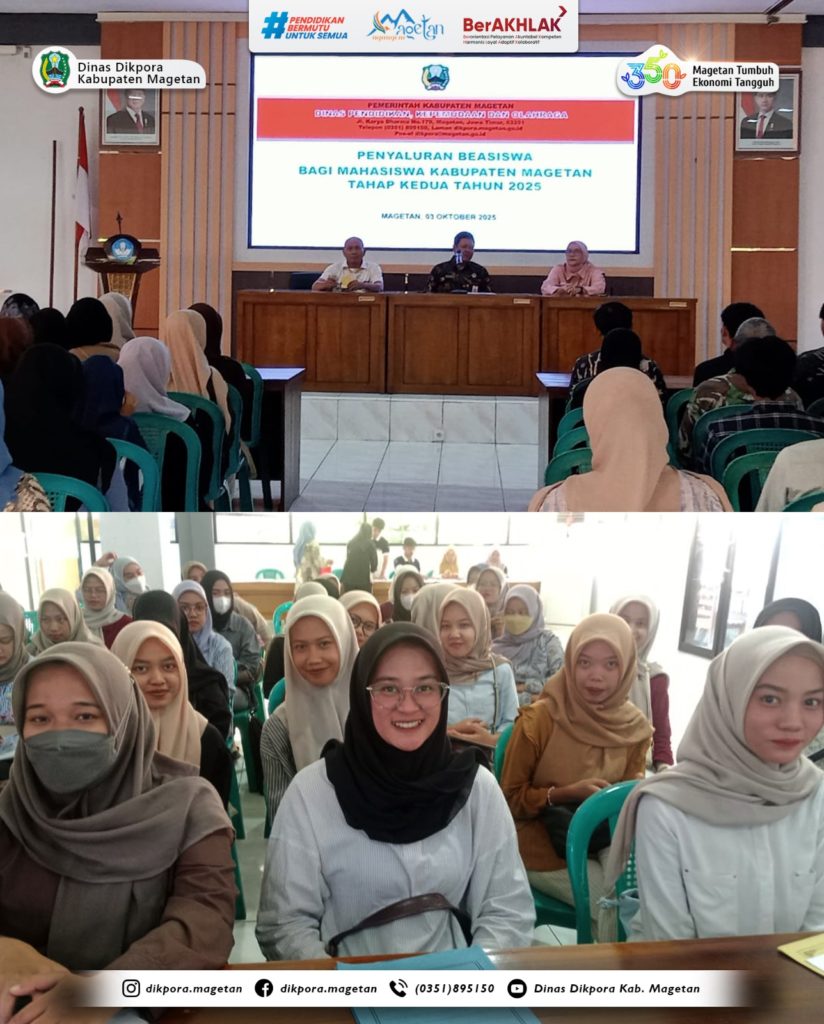 Pada hari ini, Jum’at, 3 Oktober 2025 bertempat di Aula Dinas Pendidikan, Kepemudaan, dan Olahraga Kabupaten Magetan, telah dilaksanakan penyaluran beasiswa bagi mahasiswa asal Kabupaten Magetan tahap kedua tahun 2025.