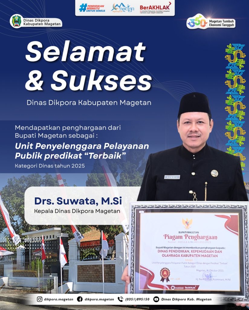 Dinas Pendidikan, Kepemudaan dan Olahraga Kabupaten Magetan kembali menorehkan prestasi membanggakan. Pada momentum peringatan Hari Jadi Kabupaten Magetan ke-350, yang digelar melalui upacara di Alun-Alun Magetan pada tanggal 12 Oktober 2025, Dinas Dikpora menerima Piagam Penghargaan dari Bupati Magetan sebagai Unit Penyelenggara Pelayanan Publik Kategori Dinas dengan Predikat “Terbaik” Tahun 2025.