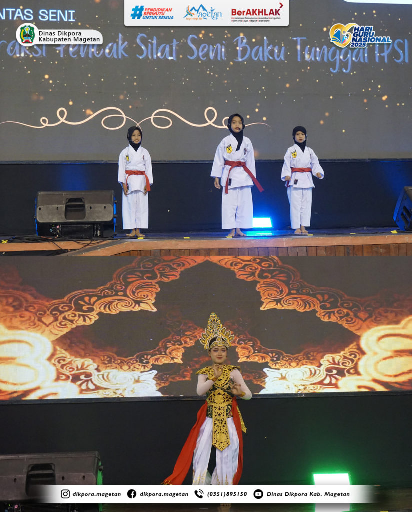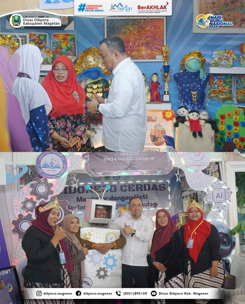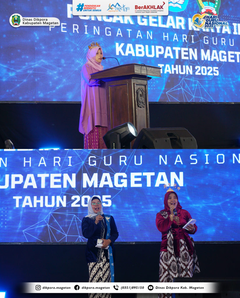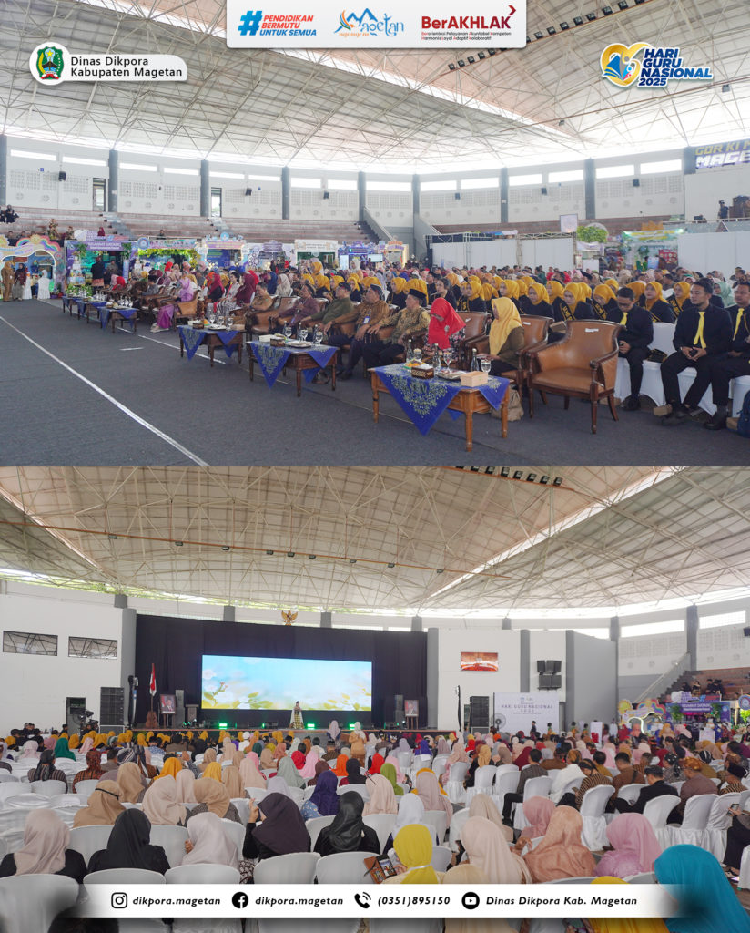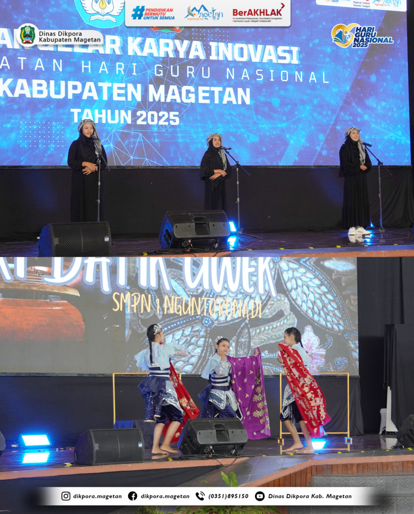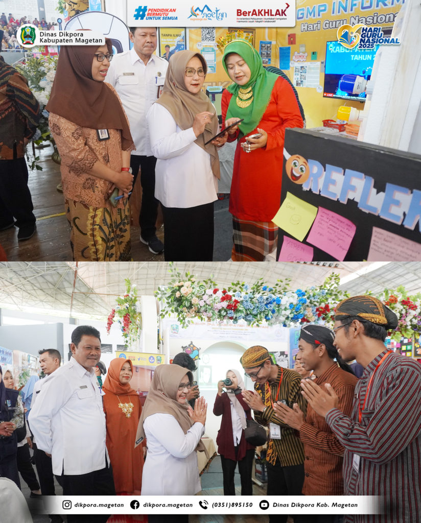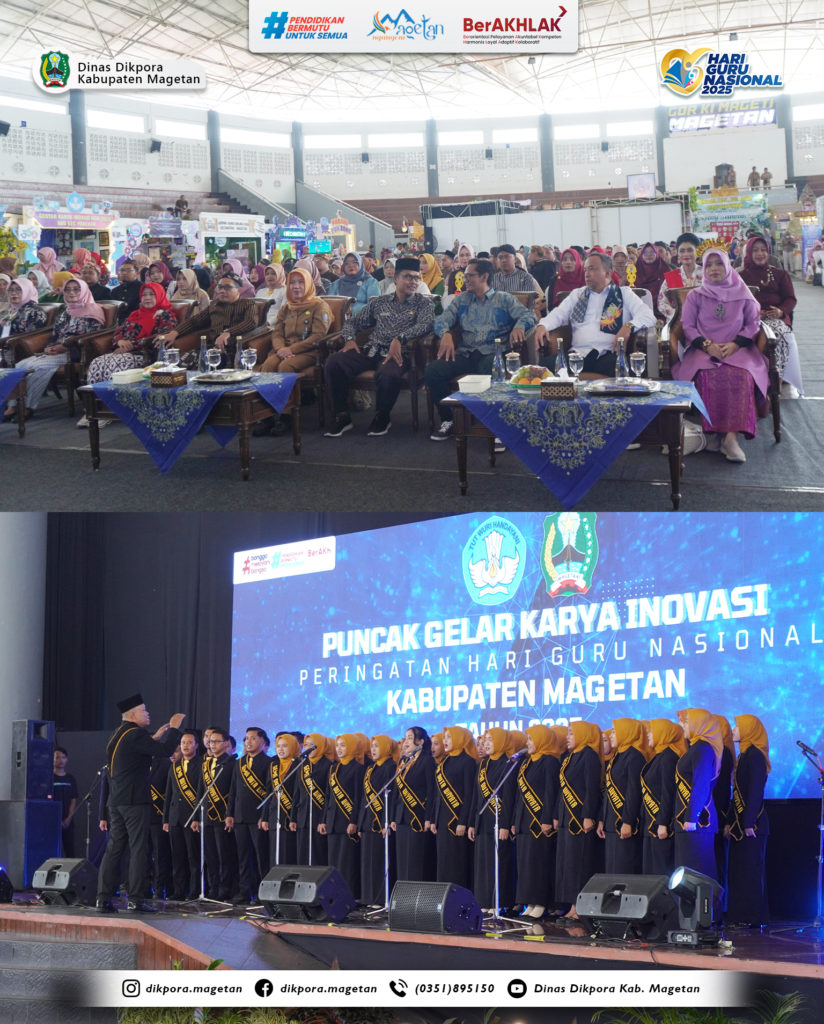 Gelar Karya Inovasi Guru dalam rangka Hari Guru Nasional 2025 berlangsung meriah di GOR Ki Mageti, Magetan. Kegiatan dibuka oleh Wakil Bupati Magetan, Suyatni Priasmoro, yang mengajak para guru terus berinovasi dan menjadi pelopor pengelolaan lingkungan di sekolah, termasuk gerakan pengelolaan sampah dan toilet bersih, kemudian Wakil Bupati mengunjungi masing-masing stand didampingi Sekretaris Dinas dan Kabid PTK. Acara Gelar Karya Inovasi dilaksanakan selama dua hari mulai 4 s.d 5 November 2025 di GOR Ki Mageti, Magetan.