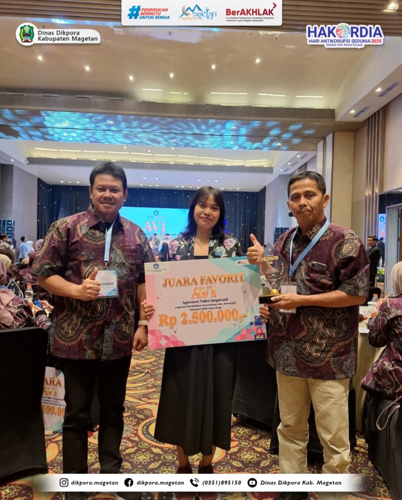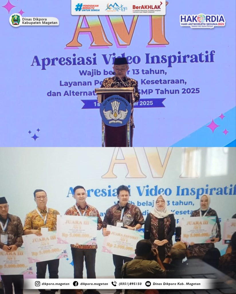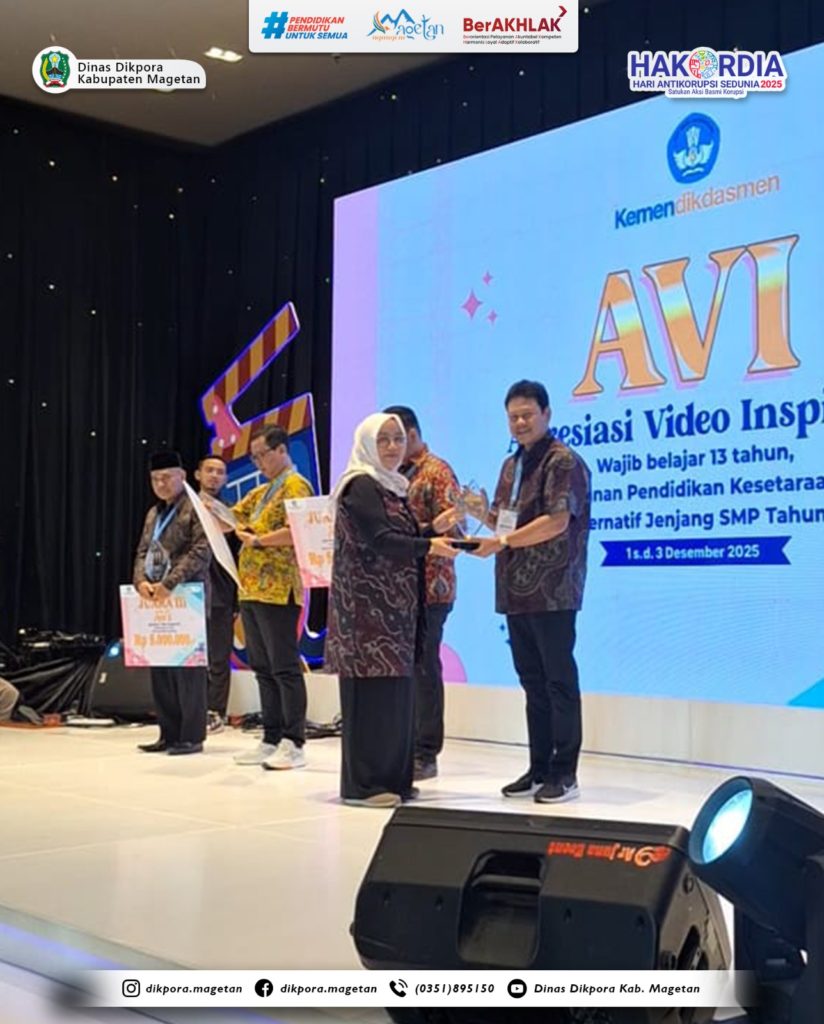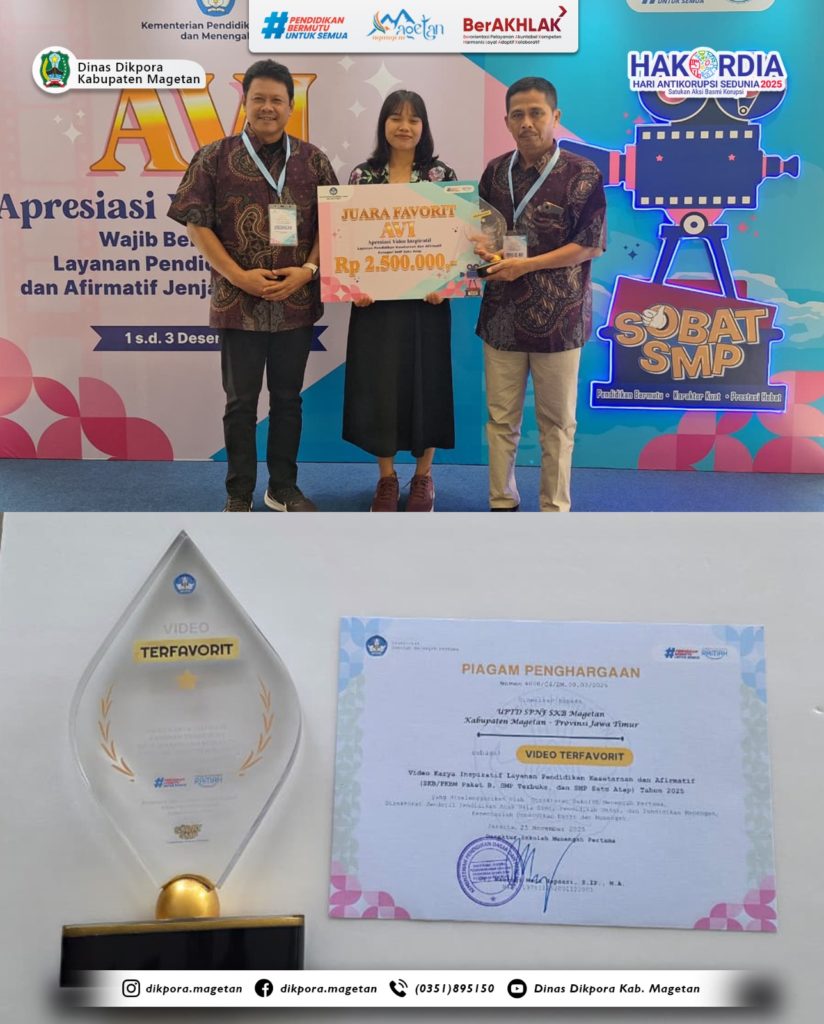 Dikpora Magetan melalui SKB Negeri Magetan berhasil meraih penghargaan dari Kemendikdasmen sebagai Juara Favorit dalam ajang Apresiasi Video Inspiratif (AVI) Wajib Belajar 13 Tahun Pendidikan Kesetaraan. Penghargaan ini diraih setelah bersaing dengan SKB kabupaten dan kota dari seluruh Indonesia. Penyerahan penghargaan dilaksanakan pada tanggal 2 Desember 2025 di Jakarta dan dihadiri secara langsung oleh Bapak Mendikdasmen.