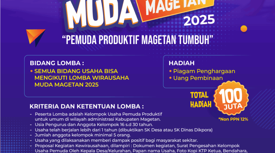 Pemuda Magetan bukan cuma generasi penerus, tapi juga generasi produktif agar Magetan tumbuh! 🚀 Saatnya pemuda Magetan buktikan karya, gagasan, dan inovasi terbaikmu di Lomba …